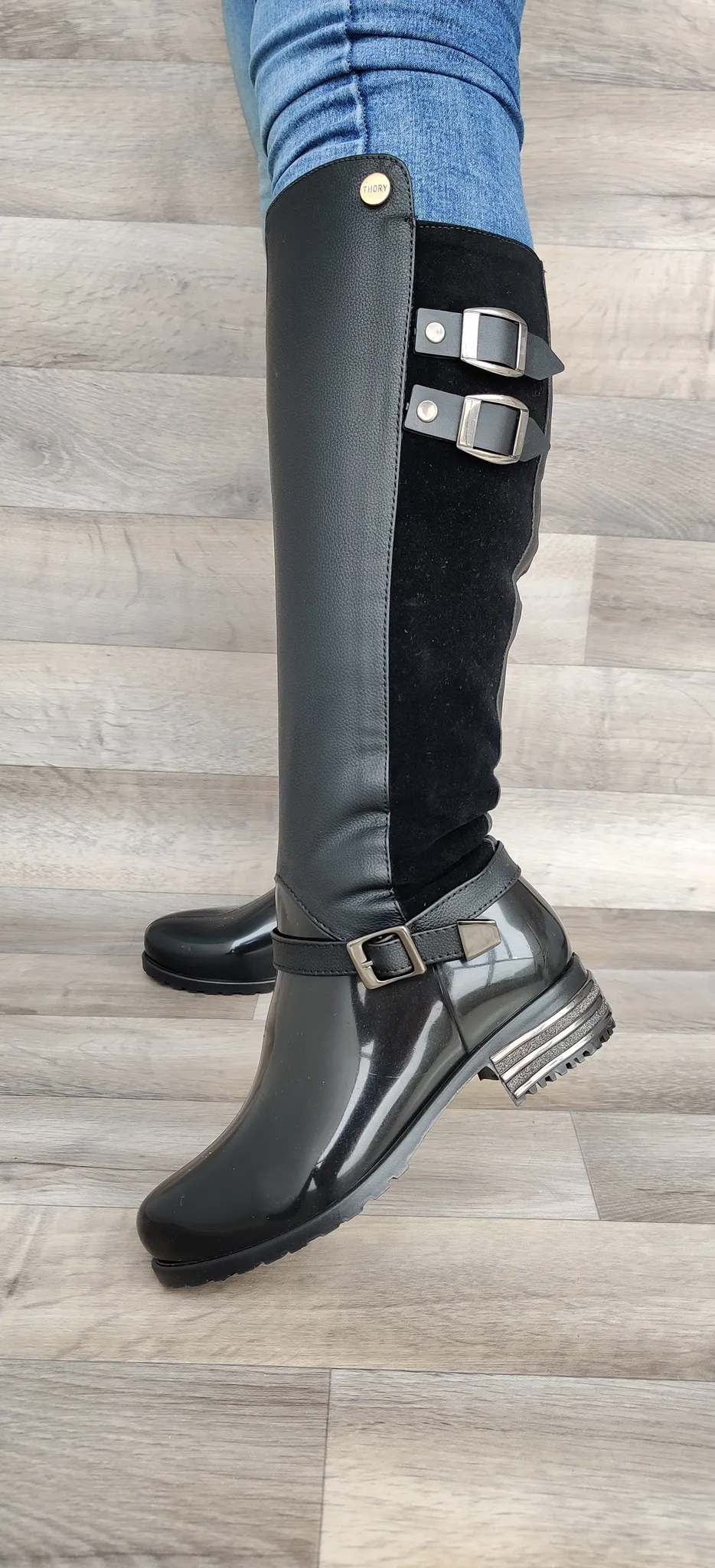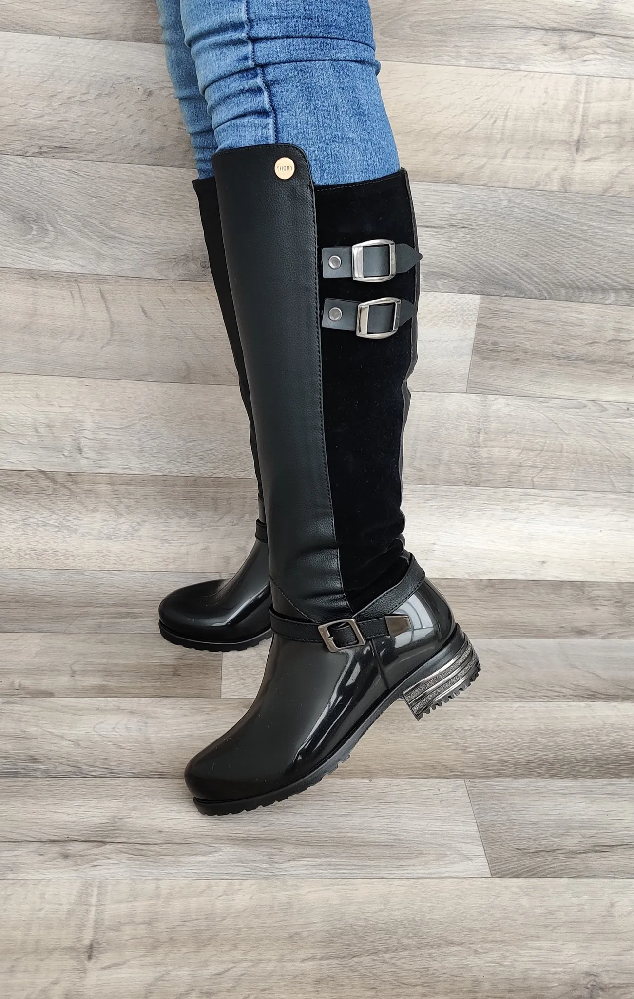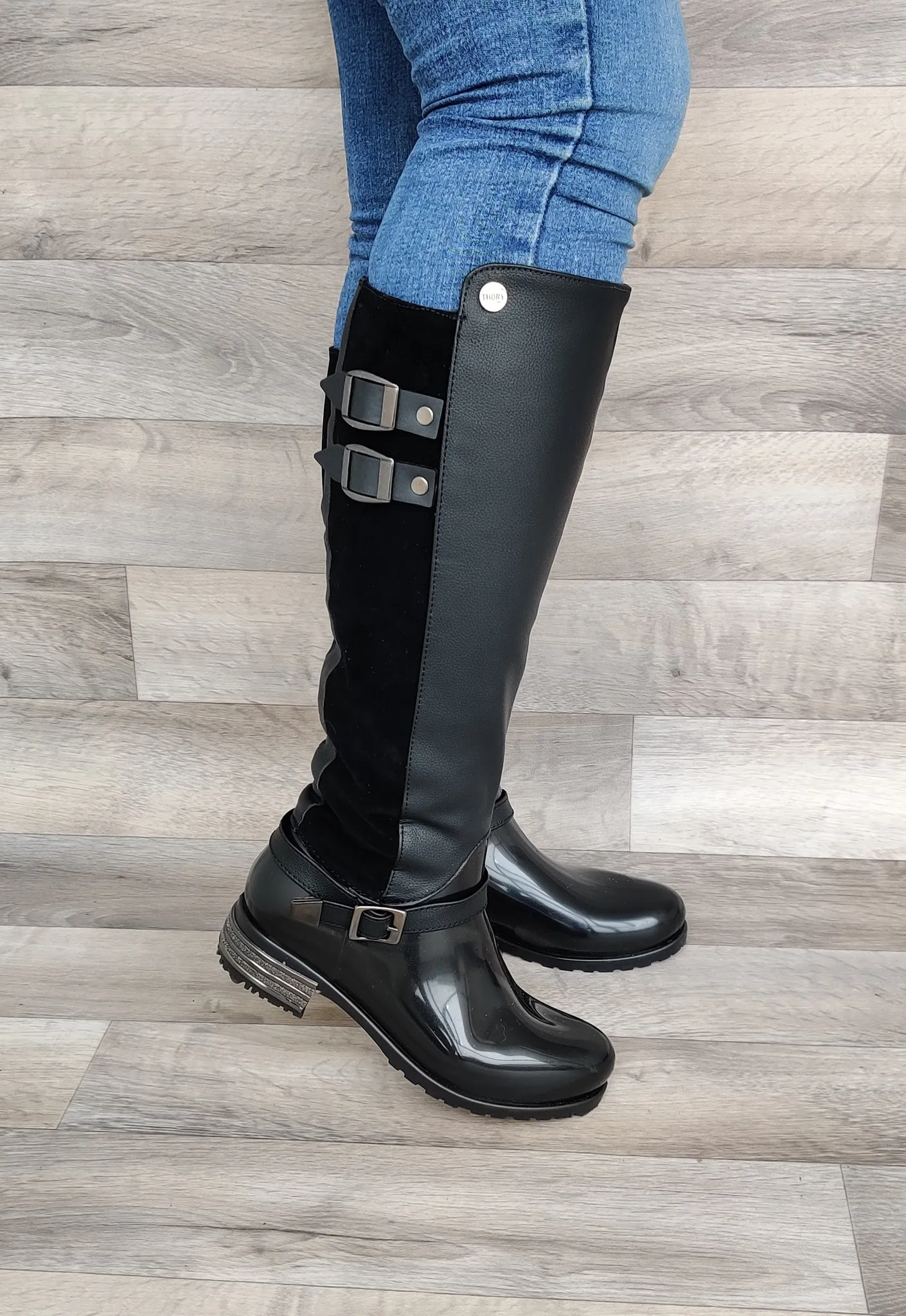Bota con vinilo pvc en el pie y caña con poliuretano sintético, con cremallera funcional y accesorios decorativos. Perfecta para lucir a la moda y proteger tus pies en cualquier ocasión. Disponible en color azul y negro, destaca con estilo!