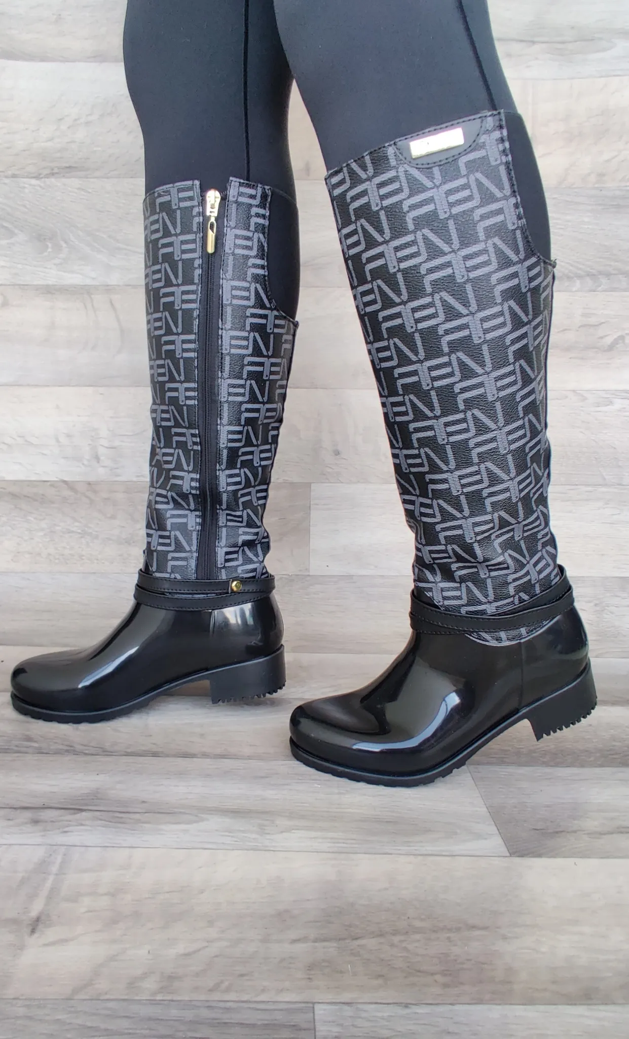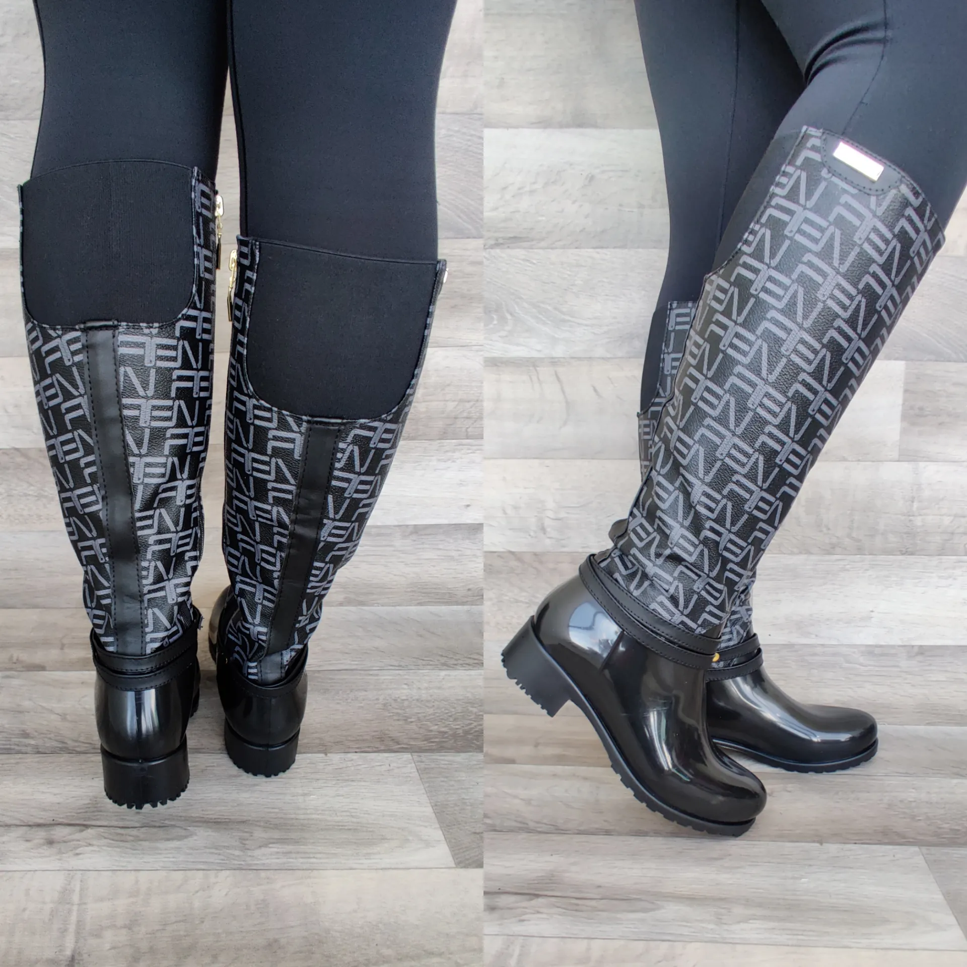 Bota con estampado en caña tipo letras en material sintético y metido en resorte parte trasera en caña. Cremallera interna funcional. Suela en pvc antideslizante con tacón de 3 cm para mayor comodidad, parte inferior de la bota 100% impermeable.